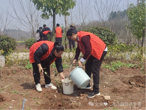 为了提高同学们的环保意识,激发大家爱林造林的热情。湖南交通工程学院经济管理学院于2025年3月11日第47个植树节到来之际开展“学雷锋”系列活动之“师生植绿意,共筑生态梦”植树活动,倡导学生爱护环境,组织学生参与校园植树活动。经济管理学院在家党政班子成员、辅导员和学生干部以及学生党员代表近30人携手植绿,为校园增添盎然生机。