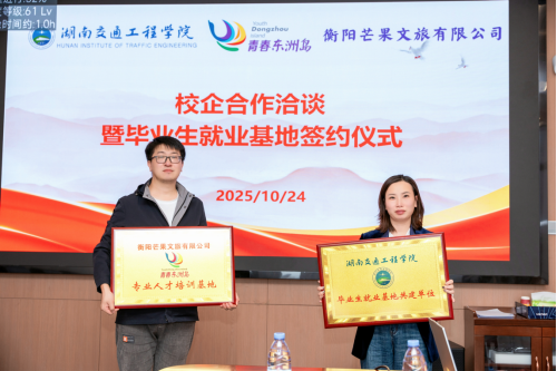 在签约授牌仪式上,双方共同为两个基地揭牌。衡阳芒果文旅有限公司正式成为"湖南交通工程学院毕业生就业基地共建单位",同时,人文与艺术学院被授予"衡阳芒果文旅有限公司青春东洲岛专业人才培训基地"称号。这一双向授牌模式标志着双方合作进入了实质性阶段。