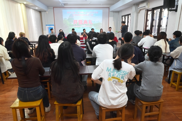 10月28日下午,我校2025年第三批英语教学社会实践活动在阳朔党校举行开营仪式,教务处长肖四喜,人文与艺术学院副院长、英语专业学科带头人刘彪出席开营典礼;第三批带队教师齐延斐、教学秘书王芳以及41名英语专业学生参加典礼;广西阳朔欧美达英文书院(Omeida Language College)院长欧达、副院长王学清,外教Jason,Andrew,Kayleigh到会指导。Andrew主持典礼。
