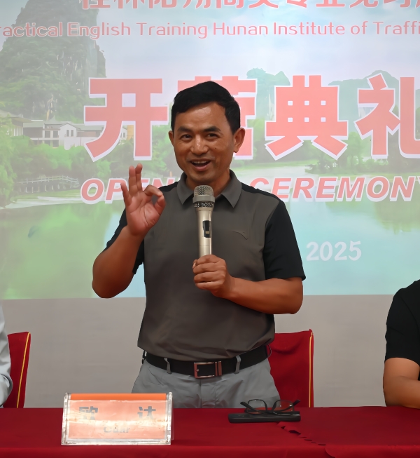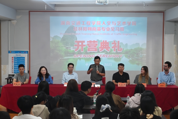 肖四喜作典礼致辞。他肯定了阳朔英语教学社会实践活动对英语专业学生口语能力提升的重要作用,并鼓励大家与社会深度互动,让青春亮丽多彩。肖四喜强调,阳朔享有地球村的美誉,常年有数千上万外国人来这旅游、生活和工作,多元文化在此交融;而欧美达培训基地作为深耕英语教学与实践多年的专业平台,不仅拥有成熟的教学体系、经验丰富的师资团队,更能为大家提供“沉浸式”的语言应用场景,这正是我们将实习地点选在这里的主要原因。校企合作、协同育人是培养应用型人才的必由之路,我们学校董事长刘福生高度重视学生的实习实训工作,学校依托优质校内教育资源,紧扣现代产业发展脉搏,将行业前沿需求深度融入育人全过程,构建起 “教学 + 研学” 双轮驱动的特色课程体系。英语专业的学习,从来不是“纸上谈兵”,语言的生命力,永远在真实的沟通与实践中绽放。开营典礼后将由外教一对一进行面试,全面考察每一个同学的语言表达能力和沟通能力;晚上将分组前往西街开展社会实践活动,任务涉及文化传播、宣讲中国故事等等。为把这个资源平台利用好,他对同学们提三点期望:一是希望同学们以“学习者”的姿态沉下心来。不仅要虚心向基地的老师请教,更要学习他们将语言技能与文化传播相结合的智慧,西街的每一位外国游客都是我们移动的老师。二要以“实践者”的勇气敢尝试。希望大家珍惜基地提供的教学实践、跨文化交流机会,大胆、主动与外国友人交流,不怕犯错、善于总结。同学们每一次沟通互动,都是提升专业能力的宝贵契机。三要以“传承者”的责任树形象。大家在外的一言一行,一举一动都代表湖南交通工程学院的形象。希望大家遵守基地的各项规章制度,尊重当地文化与基地老师的指导,展现湘交院学子“阳光、自信、坚定、有点调皮”的良好风貌,为学校与基地的长期合作筑牢桥梁。
