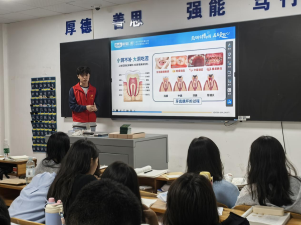 活动期间,医学技术与护理学院的志愿者利用晚自习时间,在机电楼和教学楼开展科普宣讲,围绕洁牙、龋齿、智齿、牙齿矫正等四个方面,系统讲解口腔卫生与日常生活的关联,并现场演示正确的口腔清洁方法,包括巴氏刷牙法的操作要点,以及牙线、冲牙器等辅助工具的使用技巧。活动现场还发放了细软牙刷、牙膏等实用小礼品,有效调动了学生参与积极性,引导大家养成良好的口腔卫生习惯,实现口腔疾病的早预防、早治疗。