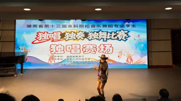 20251123日,“湖南省第十三届本科院校音乐舞蹈专业学生独唱·独奏·独舞比赛”在湖南人文科技学院落下帷幕。来自全省26所本科院校的252名音乐舞蹈专业的优秀本科生与研究生齐聚娄底,展开激烈角逐。我校人文与艺术学院音乐专业代表队参赛选手戴子涵同学发挥出色,凭借扎实的专业功底与稳定的现场表现,一举夺得通俗唱法组独唱比赛一等奖第一名。其指导教师洪子涵老师亦荣获“优秀指导教师奖”。