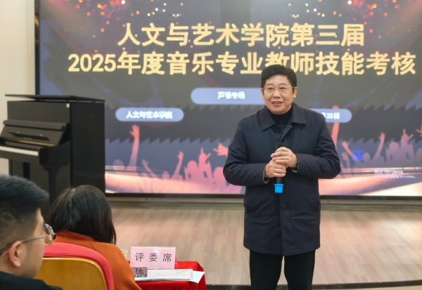 石峥嵘作考核总结讲话。举行青年音乐专业教师技能考核是为了全面了解青年音乐教师的专业技能水平,今年的考核,总体上比2024年考核更佳。这一喜人成果,离不开常态化开展的集体磨课、听课、评课活动,也得益于学校信息化教学建设与说课竞赛的有力助推。希望学院全体教师再接再厉、再创佳绩,始终把立德树人成效作为检验音乐教学工作的根本标尺。要聚焦新时代音乐艺术人才综合能力培养核心任务,结合不同课程的教学特色与目标定位,深入挖掘音乐理论知识体系中的思想内涵与精神价值,科学拓展课程的深度、广度与温度;在教学实践中持续增强内容的引领性、时代性、人文性、开放性与趣味性,以德润心、以文化人;构建全员全过程全方位育人格局,潜心教书育人,以更优异的教学成果为学校高质量发展贡献力量。