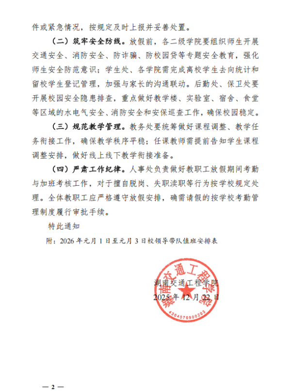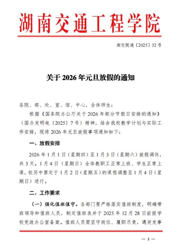 湖南交通工程学院关于 2026 年元旦放假的通知