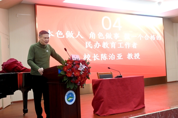 开班仪式结束后,陈治亚以《本色做人,角色做事,做一个合格的民办教育工作者》为主题,为培训班作首场专题讲座。讲座围绕“本色做人”“角色做事”“AI赋能”“合格的教育工作者”四个方面系统展开。校长以一个长期从事高等教育工作和高校领导的亲身感悟,阐述了本色做人的重要性和角色做事的原则性。“做人一定要像人”,做人就要坦坦荡荡、实实在在; 本色做人是高校教职工工作的前提和底线,严以修身才能永葆本色。做事,就要认认真真、稳稳当当,将锐气藏于胸,和气浮于脸,才气见于事,义气施与人。按角色办事是责任和担当。这几句话,看似简单却富含哲理,通俗易懂却富有智慧,深刻阐明了高校教师修身做人、从教为师、谋事创业的核心要义,是学高为师、身正为范的根本要求,理应成为我们的基本遵循。就如何做一个合格的教育工作者,校长指出,首先要做一个合格的人,要成为一名合格的教育工作者,根本在于先成为一个品德高尚、责任担当的人。教育是“一棵树摇动另一棵树,一朵云推动另一朵云,一个灵魂唤醒另一个灵魂”的事业,其核心在于人格的感染与价值的引领。结合民办高等教育特点,他对教师提出五点希望:一是以教书育人的使命责任为毕生修行;二要因材施教,与学生建立深厚情感纽带;三要聚焦学生专业成长,强化教师团队协作;四要以终身学习激发自我成长的内生动力;五要秉持 “静待花开” 之心,耐心陪伴学生成长。讲座最后,校长还围绕“世界观、人生观、价值观”作了生动阐释,引导教职工从认知高度、规划态度、判断角度等多维度夯实育人根基,筑牢思想引领的主动性和有效性。