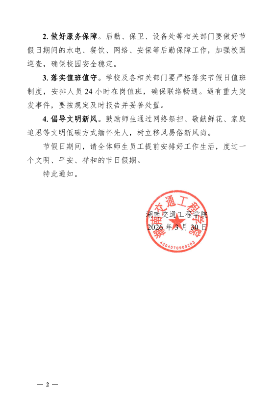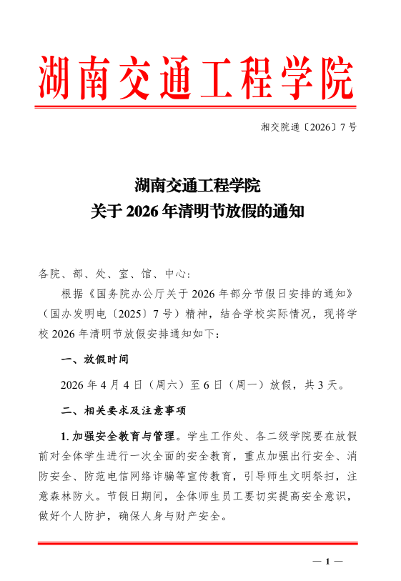 湖南交通工程学院关于 2026 年清明节放假的通知