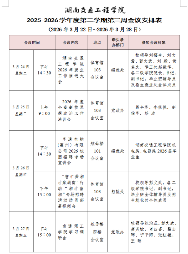 湖南交通工程学院2025-2026学年度第二学期第三周会议安排表