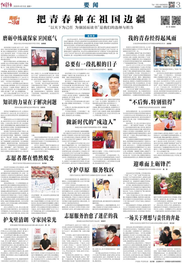本网讯(通讯员 李水华)近日,《中国青年报》要闻版以《迎难而上砺锋芒》为题,聚焦我校医学技术与护理学院2024届毕业生戴骏参与大学生志愿服务西部计划的先进事迹,生动展现了他从边境小城东兴到工程建设一线、从“软服务”到“硬骨头”的青春奋斗故事。